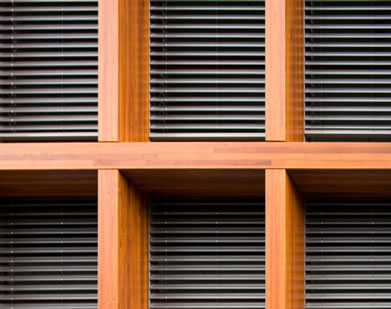 Detail Teakholzfassade mit außenliegendem Sonnenschutz